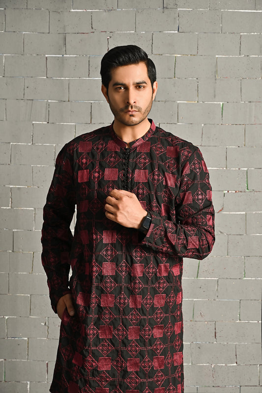 Black & Red Embroidered Kurta Trouser