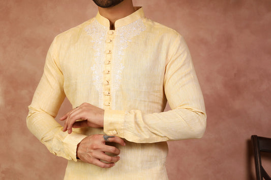 Yellow Irish Linen Embroidered Kurta