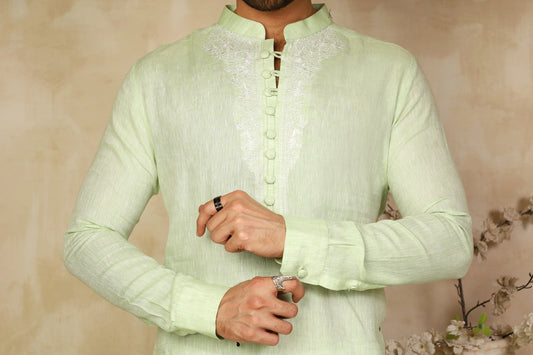 Powder Green Irish Linen Embroidered Kurta
